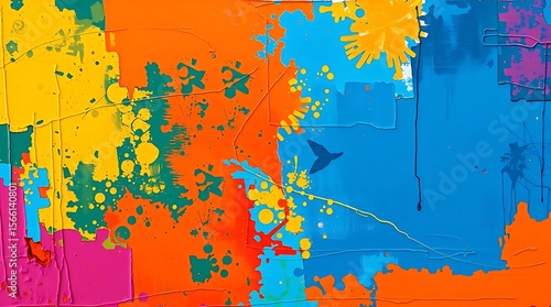 Bright Geometric Abstract Painting with Yellow, Red, Blue and Pink Color Blocks on Canvas