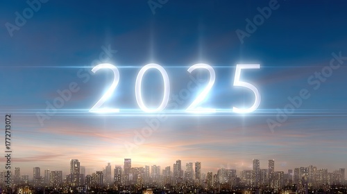 Bright glowing numbers symbolizing the year 2025 above a city skyline at sunset showcasing urban excitement and the promise of a new future