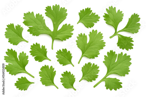Bright green cilantro leaves spread against transparent surface, highlighting herbal texture and vivid coloration for culinary graphic needs