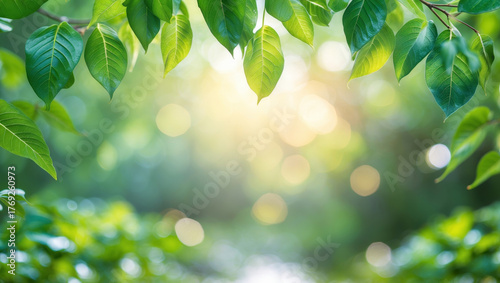 Bright green foliage with sunlight bokeh, natural background for eco design.