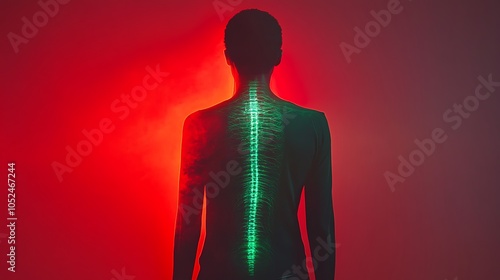 Bright green spine illuminated on person’s back in luminogram effect red lower body