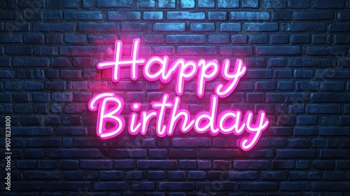 Bright "Happy Birthday" neon lights glowing on a textured brick wall, adding a festive and urban feel to the celebration