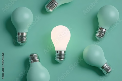 Bright illuminated light bulb standing out against unlit bulbs on soft green background. Concept of innovation, creativity, and unique ideas in modern design.
