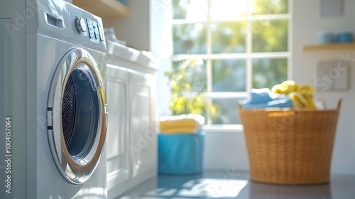 Bright Laundry Room with Washing Machine and Wicker Basket in Cozy Home Setting