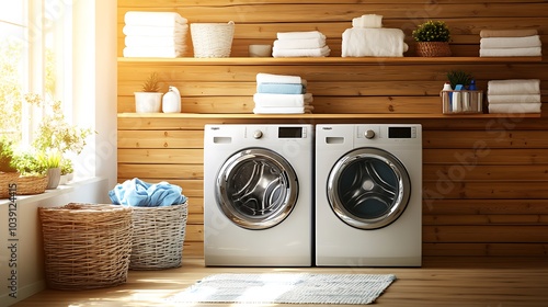Bright laundry room with wooden shelves for storage and front-loading washers.