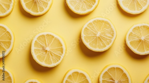 Bright lemon slices scattered on a pastel yellow background, full of citrusy zest.