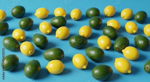Bright lemons and limes on blue background. Perfect for summer, tropical or healthy eating themes. Use in advertising, menus, or nutritional content. Fresh and vibrant!