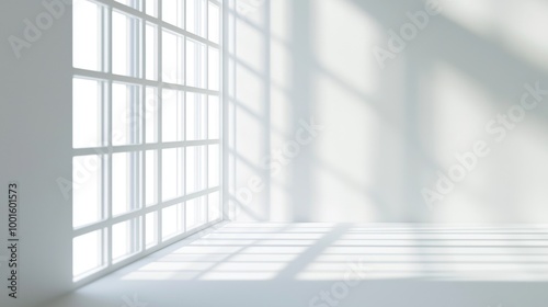 Bright light floods room through window, creating captivating geometric shapes. Empty space transformed into modern design with clean lines