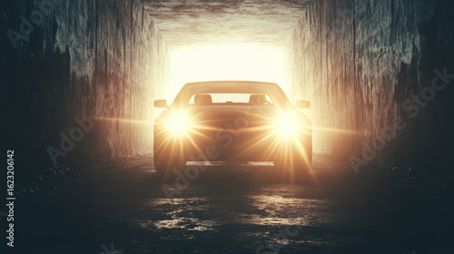 Bright light illuminates a dark tunnel entrance. A modern car emerges from the shadows.