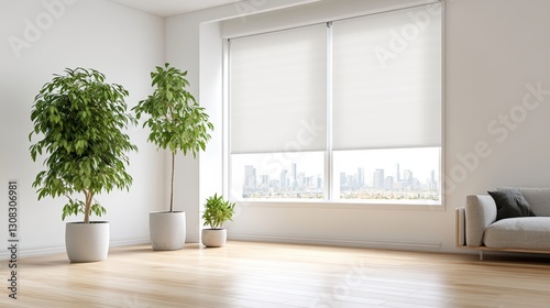 Bright living room with a plant in the corner and roller blinds creating a fresh and inviting atmosphere