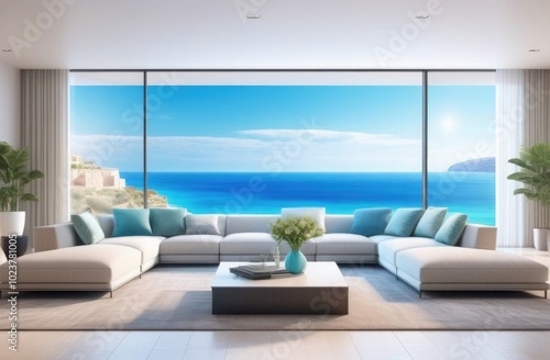 Bright living room with panoramic windows overlooking the sea. Apartments with modern design.