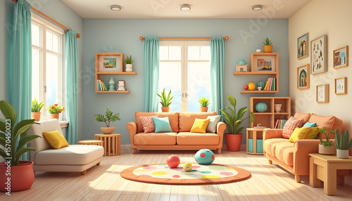 Bright living room with vibrant decor and natural light. Represents home decor, cheerful interiors, or modern design. Lively and inviting.