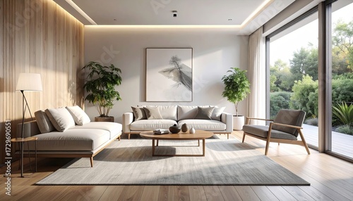 Bright Living Room with White Sofas Gray Rug and Wood Accents