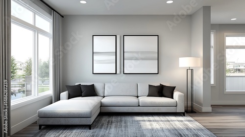 Bright living space featuring a comfortable couch, abstract art, floor lamp and natural light from large windows enhancing interior design.