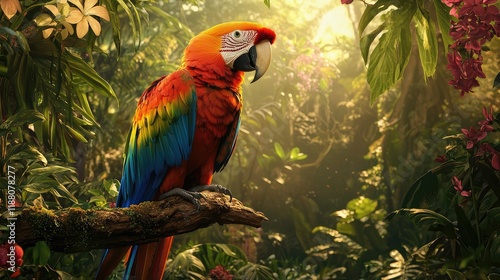 Bright Macaw Perched on Branch in Lush Tropical Jungle Setting
