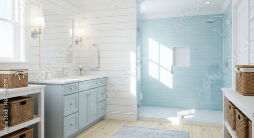Bright Minimalist Interior Bathroom with Blue Shower and White Wooden Walls