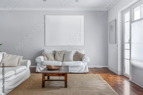 Bright minimalist living room in a luxury home with stylish minimal furniture and natural lighting. Home decor minimalist composition in neutral tonality.