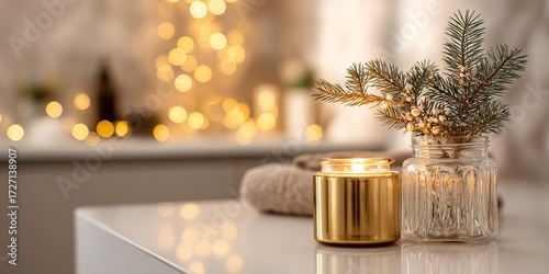 bright modern bathroom with clean white counter, single glowing candle in golden holder beside small fir branch in glass jar, blurred background with soft golden fairy lights, Scandinavian minimal