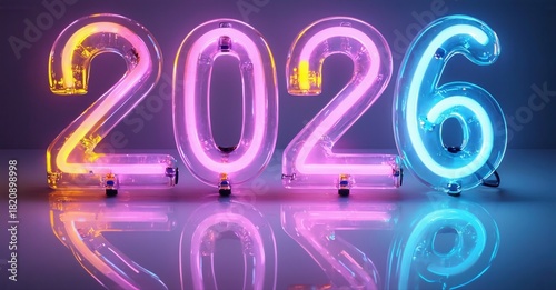 Bright neon digits display year 2026. Vivid colors reflect on glossy surface. Futuristic aesthetic, celebratory mood.