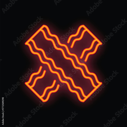 Bright neon sign depicting two pieces of bacon forming an x shape against a dark background