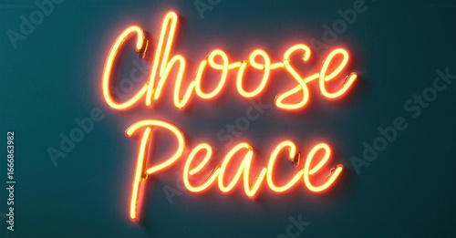 Bright neon sign displays words Choose Peace. Vivid orange glow contrasts dark teal background. Simple message, hopeful sentiment.