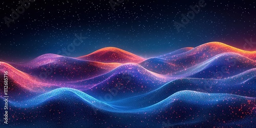Bright neon waves ripple under a starry sky in a vibrant digital landscape filled with glowing colors during nighttime