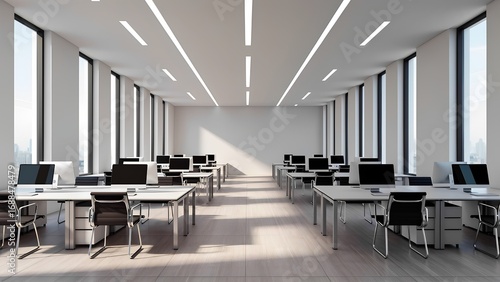 Bright office space with contemporary furniture and large windows showcasing a city skyline. Desks equipped with computers and organized office supplies create an inviting work environment.