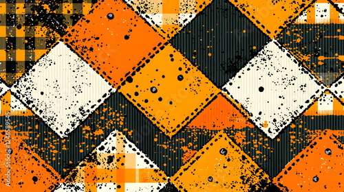 Bright orange and black patterned textile with diamond shapes and grunge textures.