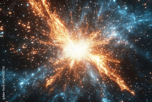 bright orange and blue starburst with a white center. The starburst is surrounded by a dark blue background