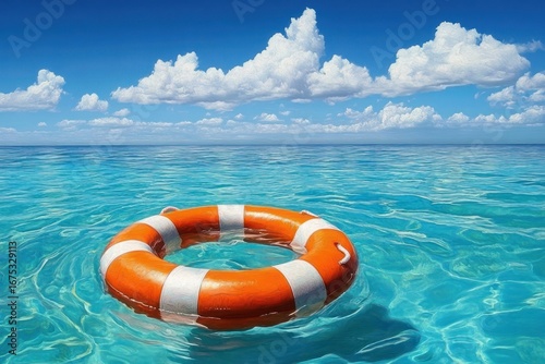Bright orange and white lifebuoy floating peacefully on clear turquoise ocean water under a blue sky with fluffy white clouds