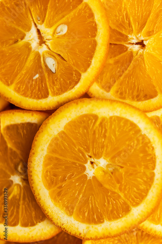 Bright orange background with slices of juicy oranges. Orange in the section. Orange-abstract fruit background, natural vitamins. Backgrounds and textures