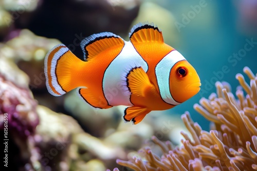 Bright orange clownfish swimming near coral reef