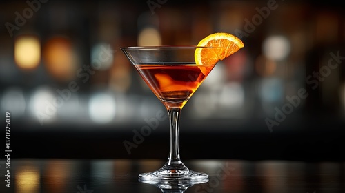 Bright orange cocktail garnished with an orange slice served in an elegant glass at a cozy bar during a festive evening gathering in the city