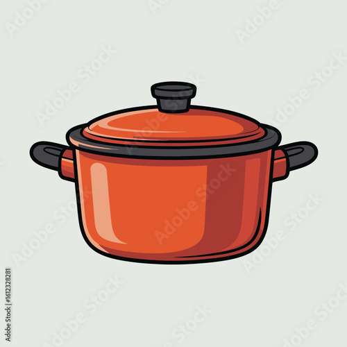 Bright orange cooking pot with lid and handles isolated on light green background