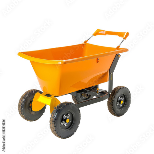 Bright orange four-wheel wheelbarrow for yard, gardening, and construction tasks, isolated on white background.