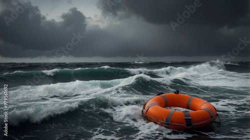 Bright orange life raft floating in stormy ocean waters