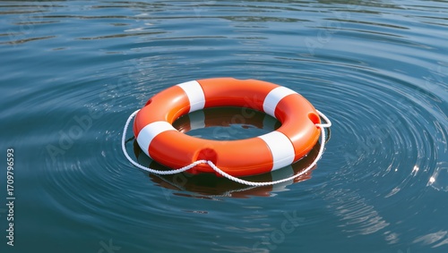 Bright orange lifebuoy featuring white stripes floats upon still blue water, creating gentle ripples under daylight, symbolizing safety and rescue within the serene aquatic setting