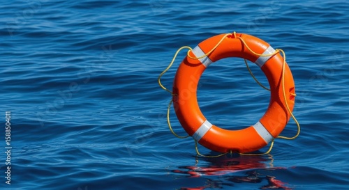 Bright Orange Lifebuoy Floating in Calm Blue Ocean Water