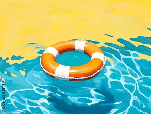 Bright orange lifebuoy floating on crystal clear blue water near a sandy beach, capturing the essence of summer and safety.