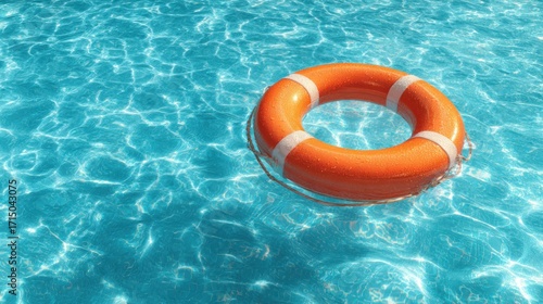 Bright orange lifebuoy floats calmly in a clear blue swimming pool. The water sparkles in the sunlight creating a relaxing summer atmosphere for swimmers.