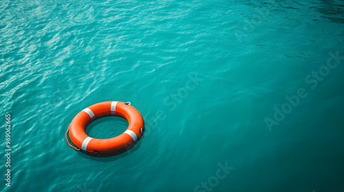 Bright orange lifebuoy floats on a tranquil turquoise sea, symbolizing safety and rescue in a serene marine setting