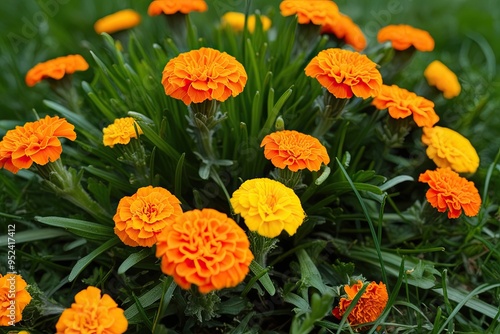 Bright Orange Marigolds Flourishing Amidst Vibrant Green Grass