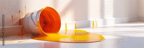 Bright orange paint spills from an overturned bucket on a clean floor near white walls in a well-lit room. Place for text