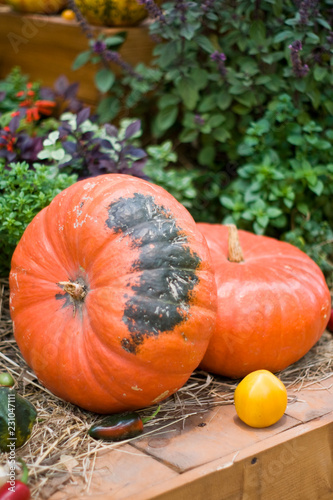 Bright orange pumpkins fall garden in green leaves