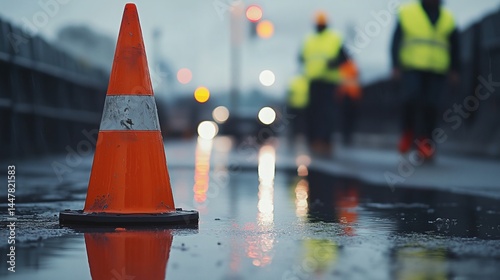 Bright Orange Traffic Cone with Reflective Stripe on a Wet Asphalt Road with Blurred Construction Workers in the Background