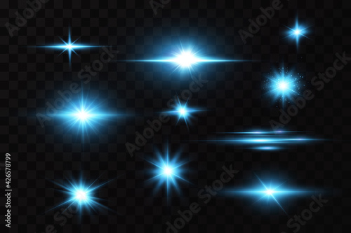 Bright particles, burning blue lights, stars, lasers. Vector.