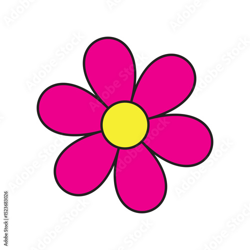 Bright Pink Cartoon Flower with Yellow Center and White Background