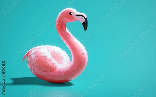 Bright pink inflatable flamingo float casting shadow on smooth turquoise surface with playful and vibrant atmosphere