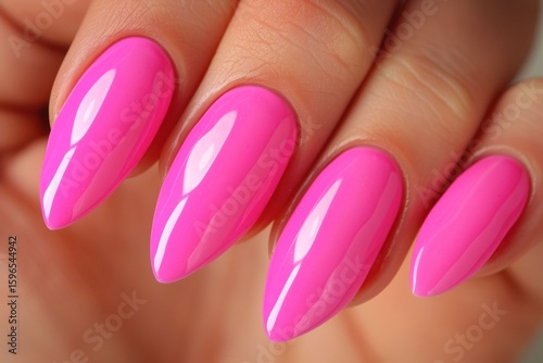 Bright pink manicure showcasing stylish almond-shaped nails in a close-up view