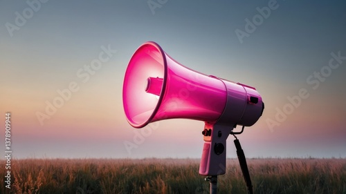Bright pink megaphone stands in a serene field at dusk, capturing the beauty of a tranquil evening